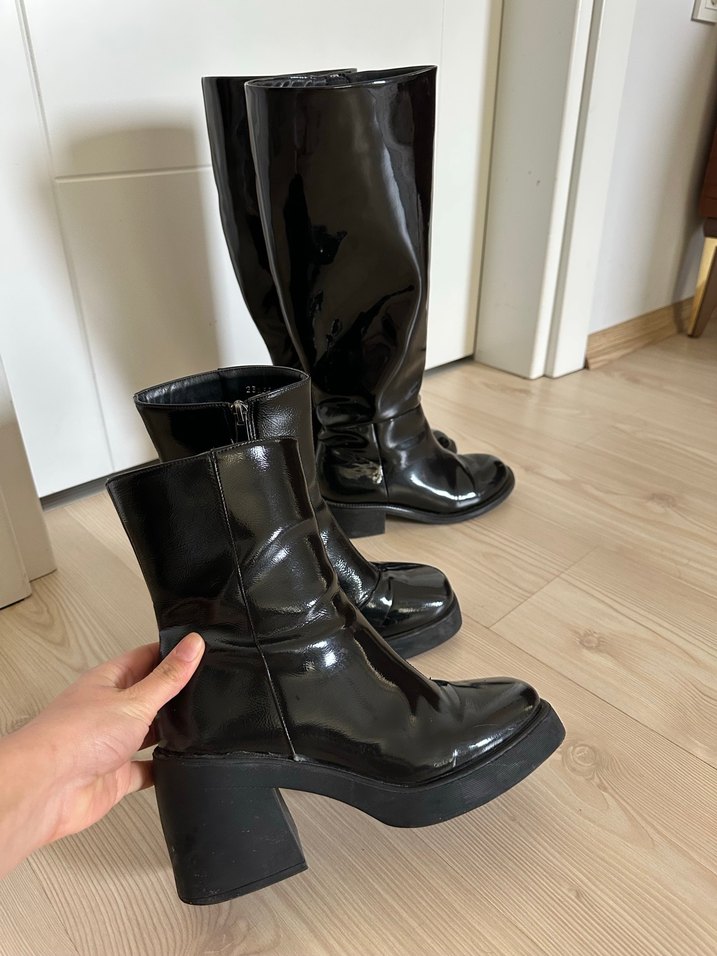 Parlak siyah kauçuk malzemeden yapılmış, blok topuklu gotik tarzda kadın botları. Koyu renk ve şık tasarımıyla günlük kullanıma uygundur.