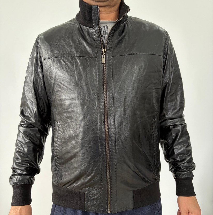 Erkekler için siyah parlak deri biker ceket, yüksek yakalı ve fermuarlı. Normal kesim, uzun kollu ve günlük kullanıma uygun.