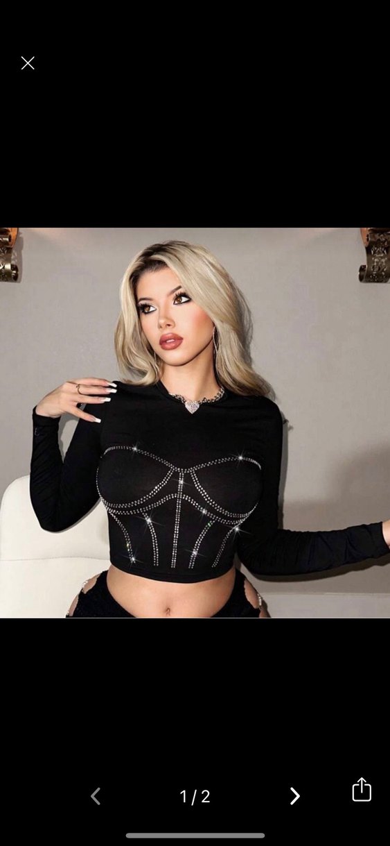 Siyah, uzun kollu, işlemeli ve pul işlemeli detaylara sahip fit kesim crop top, cesur gotik tarzıyla parti için ideal. ✨ Sadece bir kez kullandım. Ertesi gün kargo.