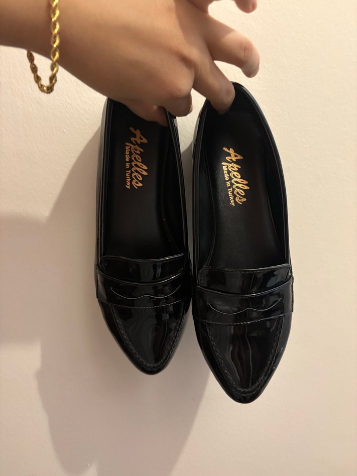 Ofis kullanımı için uygunsiyah parlak kadın babet pileli detaylara sahiptir. İç kısmında Apelles markası bulunur.