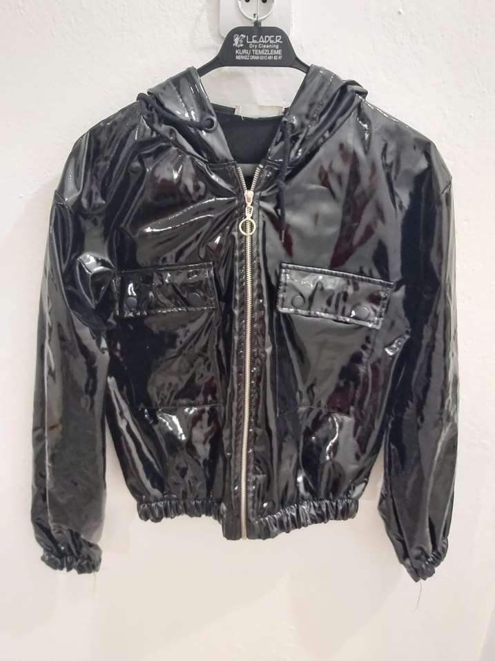 Parlak siyah deri, kapüşonlu, kısa ve dar kesim kadın ceket. Uzun kollu ve cep detaylı, sokak modasına uygun.