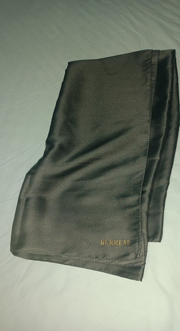 Siyah, parlak ve ipeksi dokulu kadın eşarp BERREME logosuyla. Drapeli tasarımı iş ve sokak modasına uygundur.