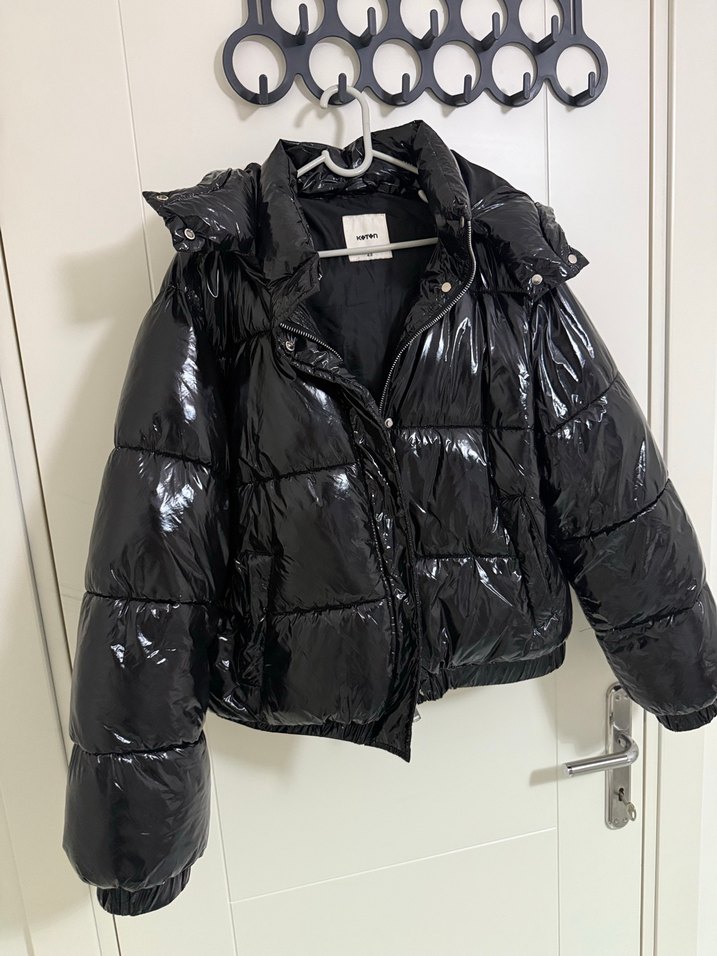 Siyah, vücuda oturan bu kışlık mont, yakalı ve düğmeli kapamalıdır. Sentetik kumaştan yapılmış, parlak ve sokak stili görünüm sunar. Normal midi boyda ve askılı kolludur. 42 beden ama ben 38 beden biriyim bana rahatlıkla oluyor oversize
