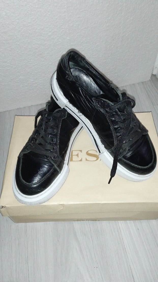 Siyah parlak rugan görünümlü, düz tabanlı kadın spor ayakkabısı. Goth sokak stilini yansıtan, trend ve rahat bir model. kenarda deformesi mevcut