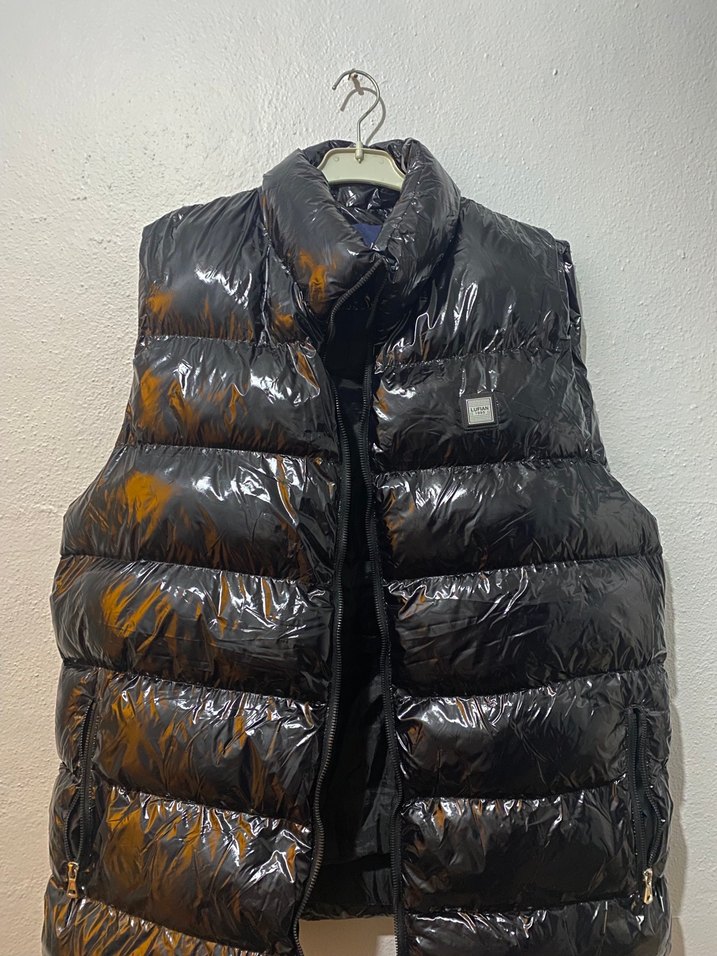 Siyah, parlak ve kolsuz yelek. Yüksek yakalı, tokalı ve sentetik kumaştan yapılmış, sokak stiline uygun, midi boyda ve vücuda oturan tasarım.