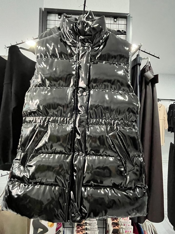 Ürün mağaza ürünüdür etiketlidir defosu yoktur. Siyah parlak sentetik kumaştan yapılmış, yüksek yakalı ve fermuarlı kadın yelek. Midi boy, dar kesim ve sokak stiline uygun.Pazarlığa açığız geniş bir kalıbı vardır s ve m bedeni mevcuttur.