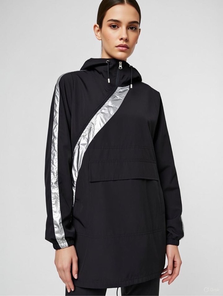 Siyah parlak, yüksek yakalı ve uzun kollu, bol kesim. Fermuarlı ve kollarda gümüş şerit detaylı, trend günlük kullanım için uygun.