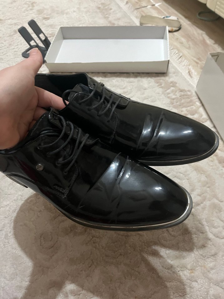 Siyah parlak yüzeye sahip, tokalı detaylı, dayanıklı kauçuk malzemeden yapılmış klasik erkek ofis ayakkabısı.