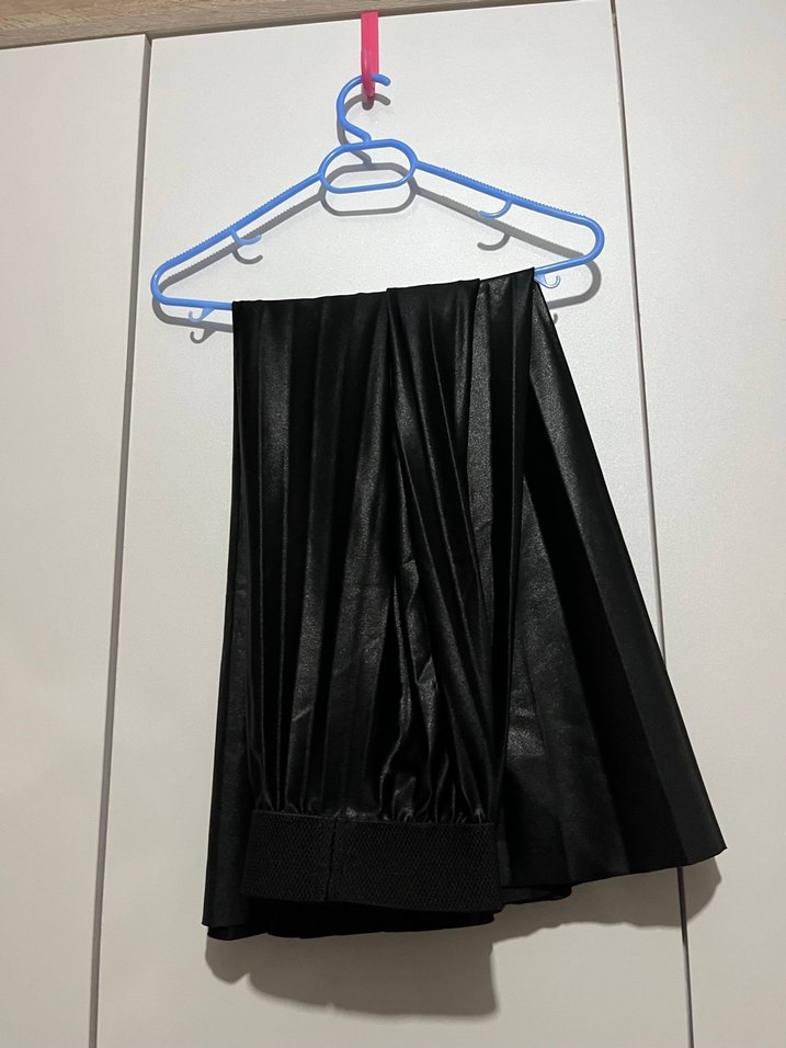 Mavi askıya asılı, parlak siyah kumaştan yapılmış pantolon. Bel kısmı lastikli ve dokusu pürüzsüz.