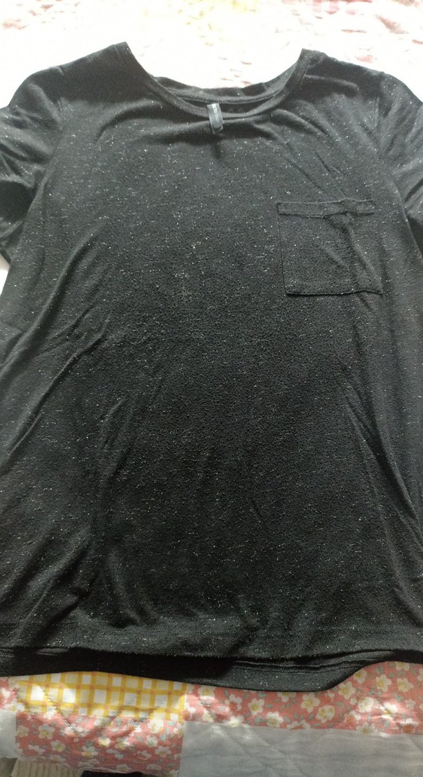 Siyah parlak sentetik kumaştan, kısa kollu, yuvarlak yakalı ve salaş kesim hamile tişörtü. Küçük göğüs cebine sahiptir, gündelik sokak stili için uygundur.