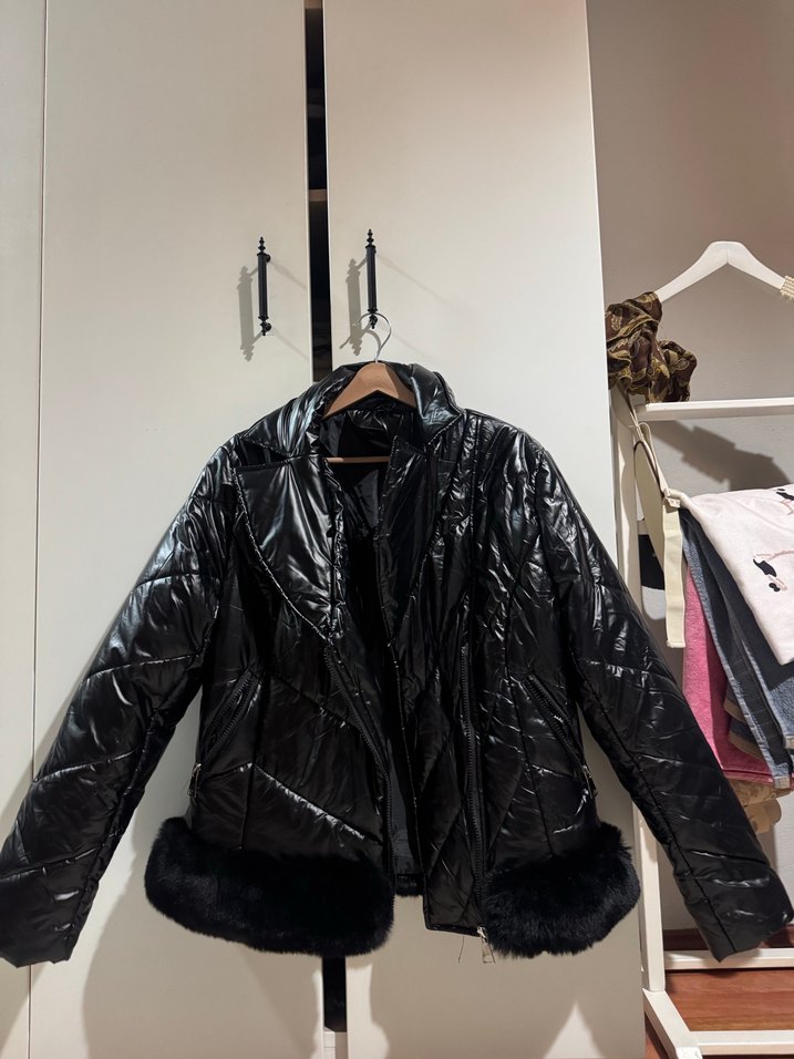 Siyah parlak Kürklü Kadın Mont