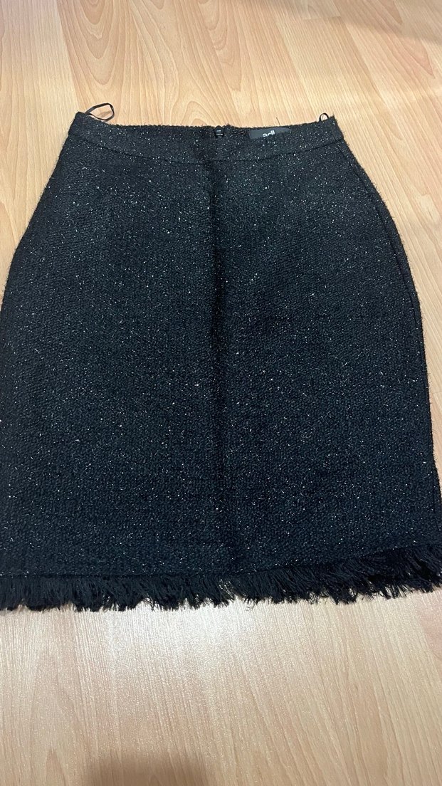Parlak siyah sentetik kumaştan, kürk detaylı ve kısa kesim, ofis için uygun şık ve rahat mini etek.