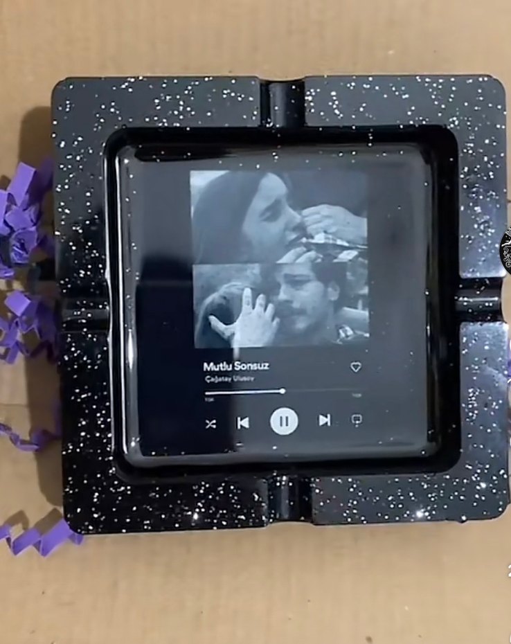 Siyah renkli, parlak ekranında "Mutu Sonsuz" şarkısını çalan medya oynatıcı, benekli şık bir çerçeveli küllük.