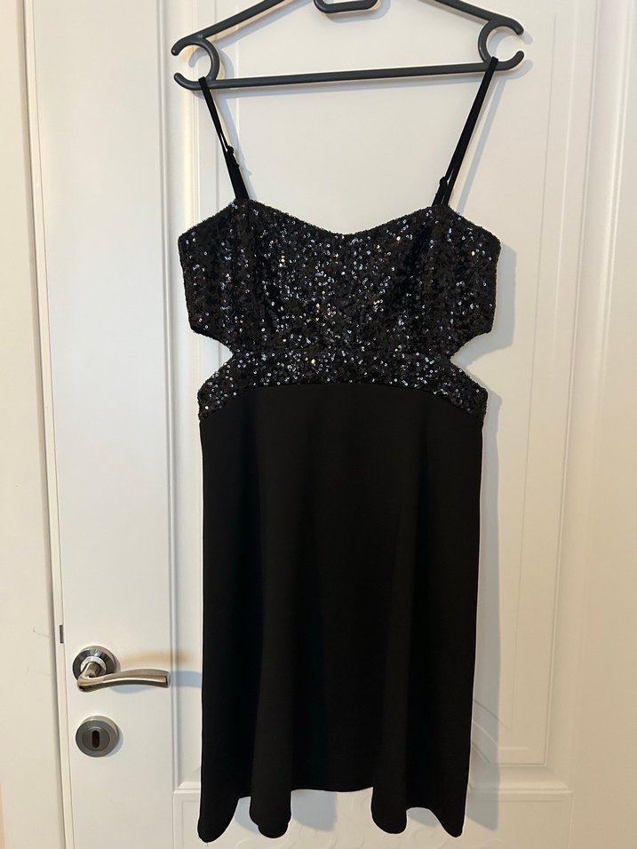 İnce askılı ve straplez yakalı, parlak detaylı siyah mini elbise, cesur romantik akşamlar için uygun. Yanları pencereli, alt kumaş dökümlü ve çok rahat.✨Askıdan sonra boyu76 cm