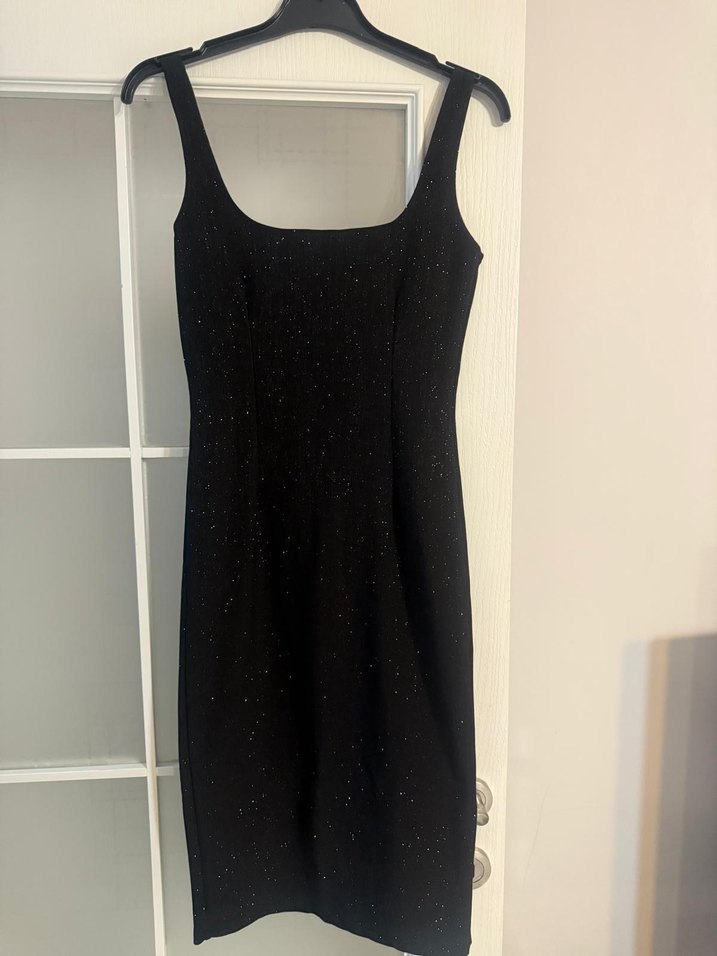 V yaka, kolsuz, simli siyah midi elbise, dar kesim ve desensiz. Minimalist gotik tarzda, romantik akşamlar için ideal. ✨