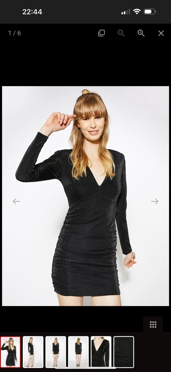Bu siyah parlak elbise, V yaka ve uzun kollu, vücuda oturan kesime sahip. Hiç kullanılmadı