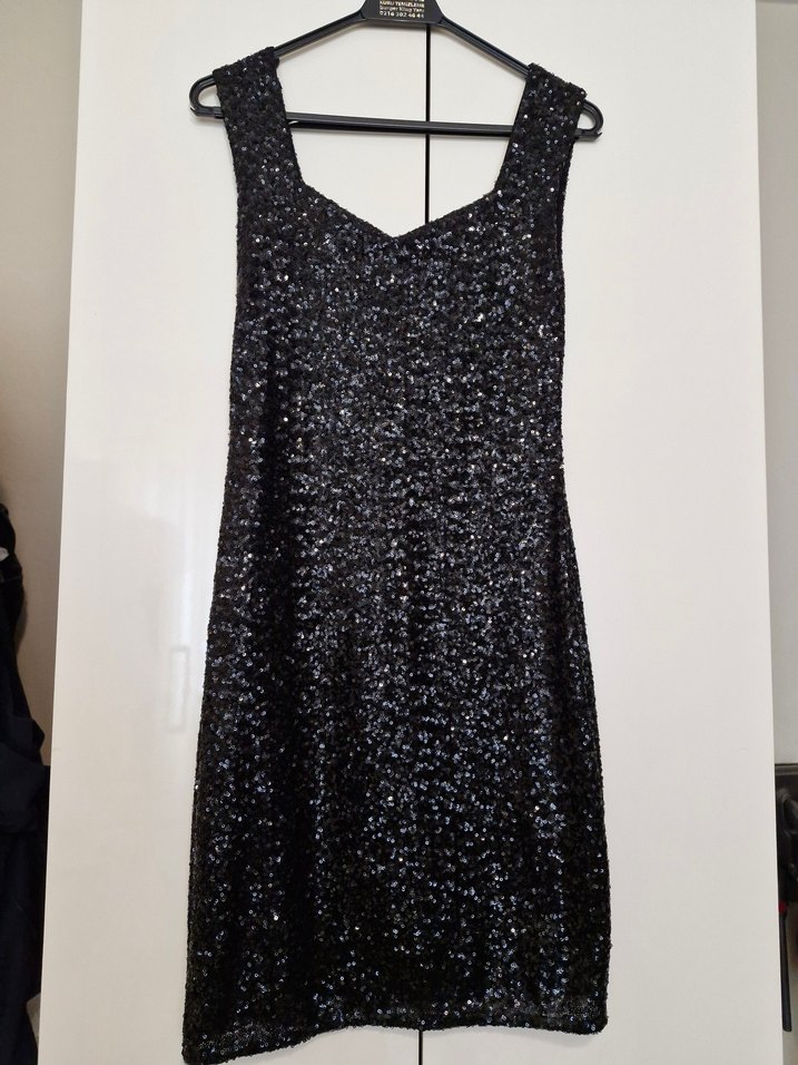 Siyah, kolsuz, V yaka ve midi boyda, vücuda oturan kesime sahip parıltılı elbise. Partiler için göz alıcı ve şık bir seçenek. ✨