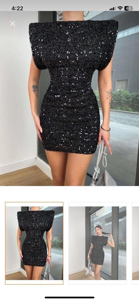 Bu siyah parlak mini elbise Parlak detaylarıyla göz alıcı bir sokak stili sunar. Parti için uygun. ✨