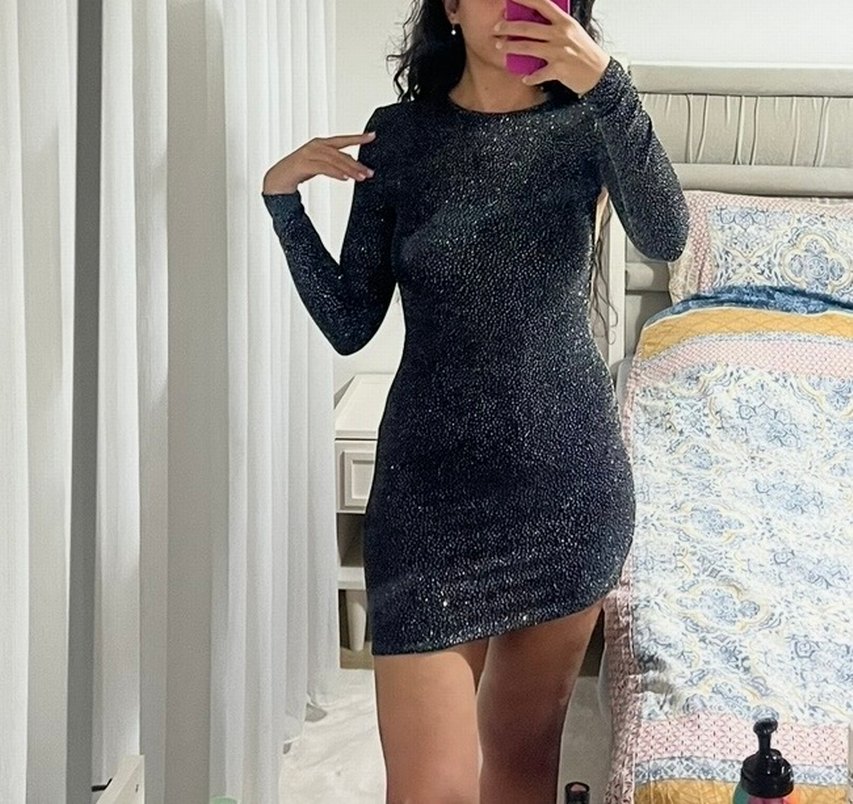 Uzun kollu, siyah parlak mini elbise. Sentetik kumaştan, modern yılan deseniyle dikkat çeker, romantik geceler için ideal. ✨ Yılbaşı Elbisesi