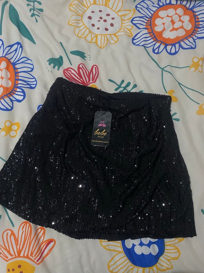 Parlak sentetik kumaştan, kemerli, bol kesim siyah mini etek, romantik gece için uygun. ✨