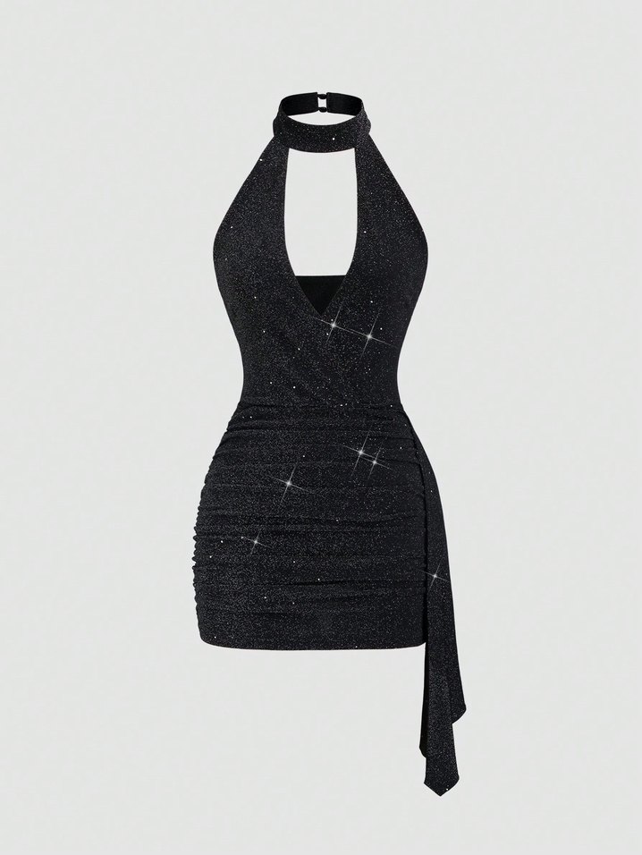 Siyah Parlak Mini Halter Yaka Elbise