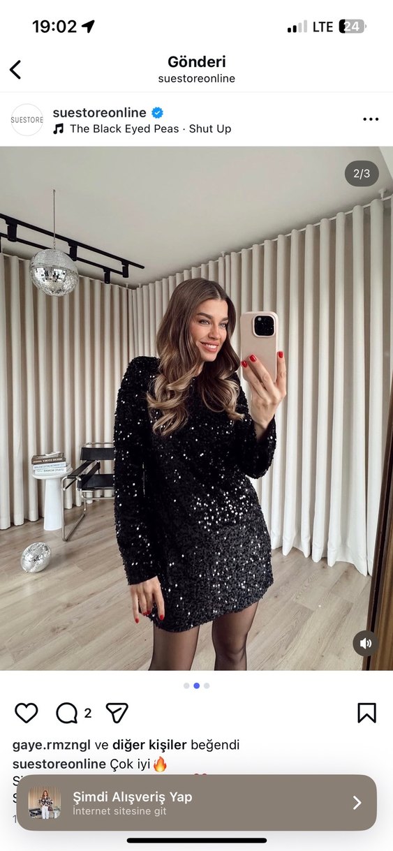 Yalnızca 1 kez 2 saat kadar giydim. Hiçbir oynama vs yapılmadı. Etiketi üzerindedir. Yıkama da yapılmadı. Boyu durusu bu sekilde . 160 boy 55 kilo 9 cm topuklu ile giydim. Cok güzel bir elbise pullar batma yapmıyo ve ışıl ışıl parlıyor Parlak detaylara sahip, uzun kollu, yüksek yakalı ve vücuda oturan siyah mini abiye elbise.