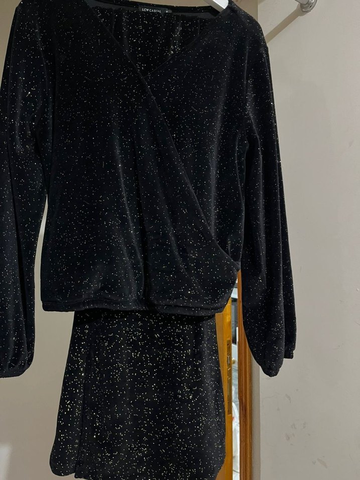 Siyah, uzun kollu, V yakalı ve mini boyda, hafif ışıltılı, rahat ve trend parti takimi
