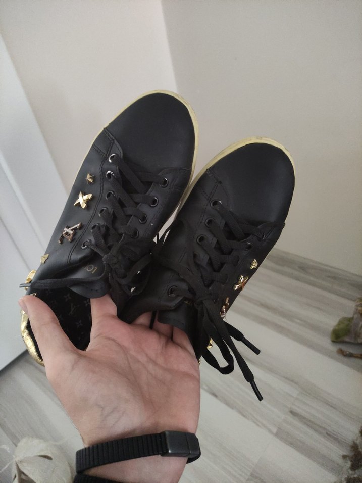 Siyah parlak nakışlı, tokalı ve stiletto topuklu spor ayakkabılar, günlük kullanım için grunge punk tarzı sunar.