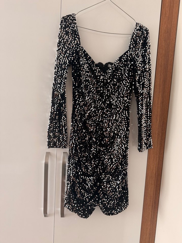 Siyah, desenli payetli, uzun kollu, V yaka, dar kesim mini abiye elbise. Partiler için uygun ve dikkat çekici.