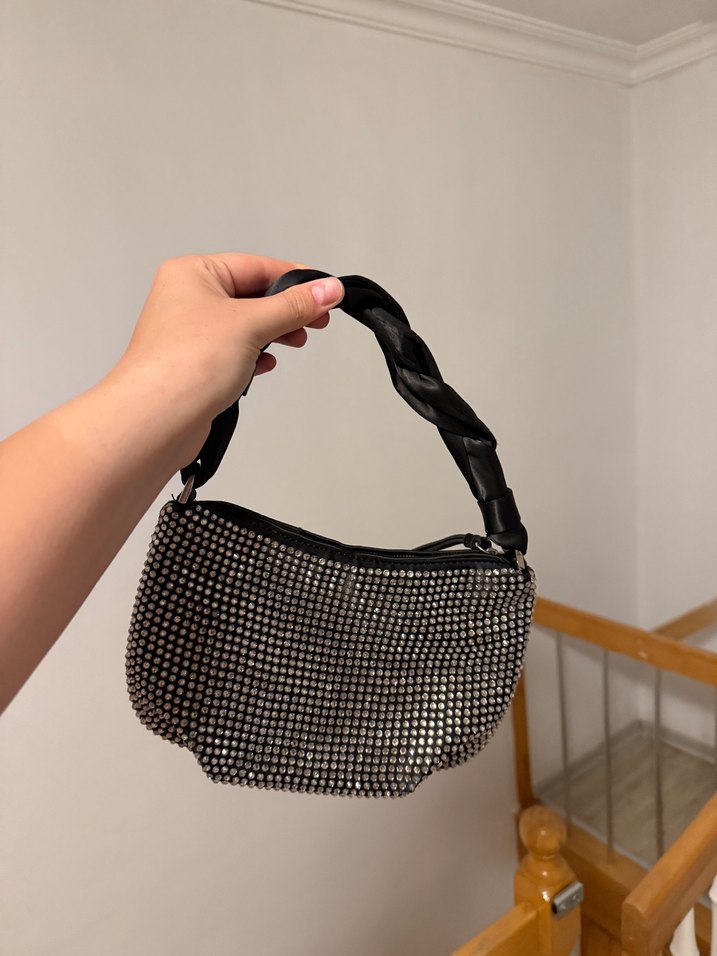 Siyah payetlerle kaplı, yılan desenli ve örgü saplı kadın el çantası. Sentetik kumaştan, günlük kullanım ve sokak modasına uygun.