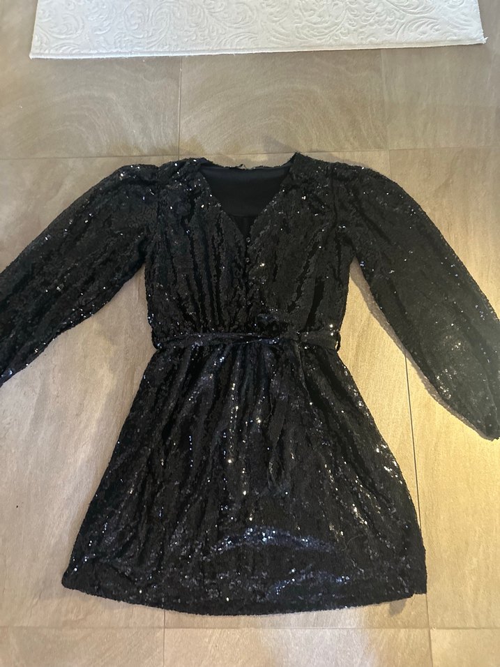 Siyah, v yaka ve uzun kollu, fit kesim midi elbise, ışıltılı detaylarla romantik geceye uygun gösterişli gotik tarzda. 1 gece giyildi problemsiz