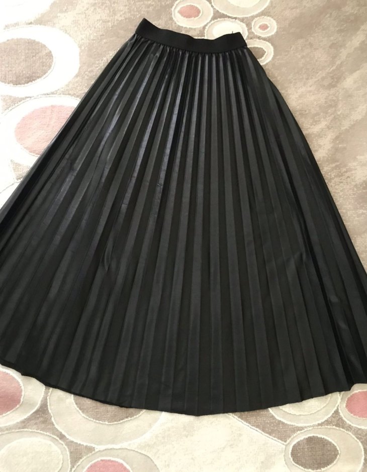 Siyah parlak sentetik kumaştan, pileli ve bol kesim uzun etek, gotik parti stilleri için uygundur.