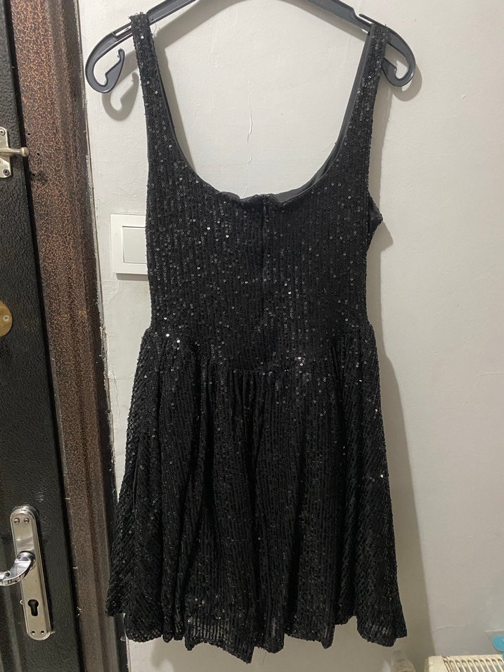 Kolsuz, siyah, pilili midi elbise, hafif parlak detaylara sahip,cepli, partiler için uygun ✨