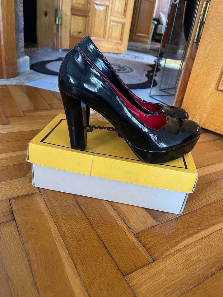 Parlak siyah platform topuklu ayakkabılar, cesur gotik tarzda, kauçuk malzemeden. Ofis için uygun, desenli ve koyu renk canlılığıyla.