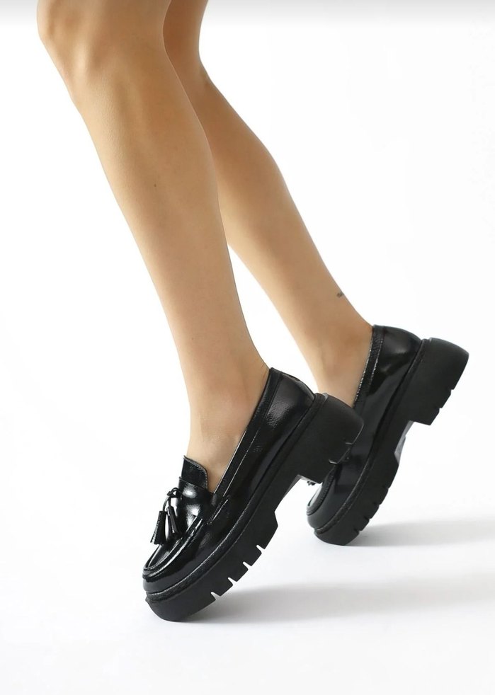 Siyah parlak platform topuklu kadın oxford ayakkabılar, tokalı detaylara ve kauçuk malzemeye sahiptir. Minimalist goth tarzında, ofis için uygundur. Limoya loafer makosen ayakkabı. Çok rahat ayakkabı, benzer modelden elimde olduğu için satıyorum. Topuk 4 cm