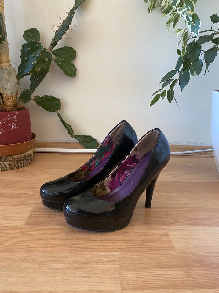 Siyah parlak platform topuklu, baskılı iç astarlı kauçuk malzemeden yapılmış cesur goth tarzı kadın stiletto. Romantik akşamlar için uygun. Üzerinde hafif çizikler var ama çok iyi durumda.