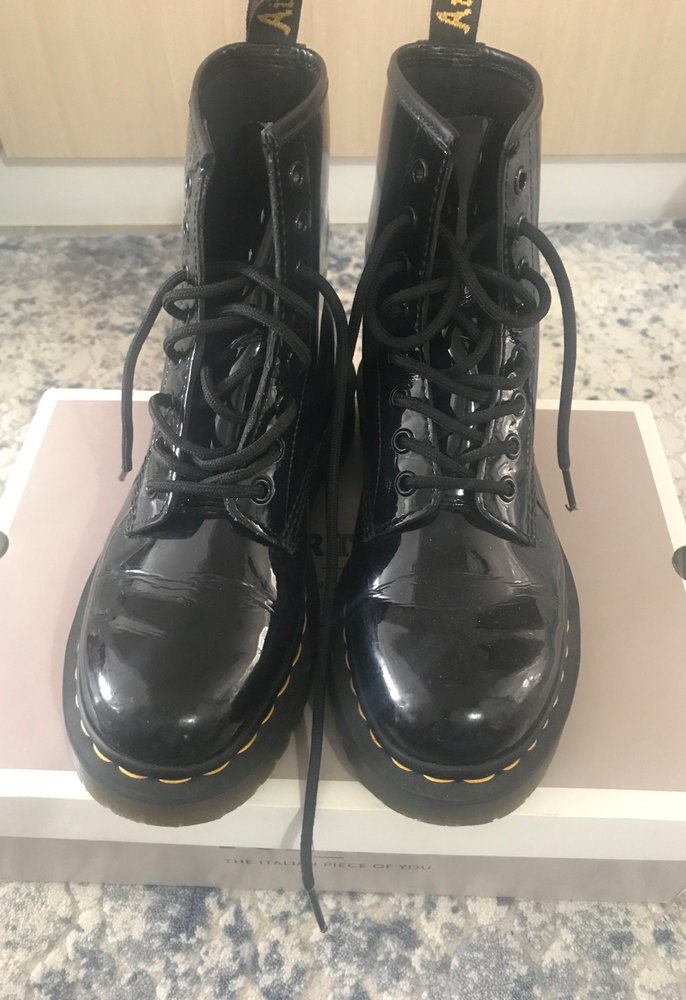 Siyah parlak kauçuk botlar, platform topuklu ve bağcıklı. Desensiz, grunge punk tarzında rock punk havası taşıyor, günlük kullanım için uygun. Hiç kullanılmadı bir yada iki kere mutlaka değerlendirilmesi gereken bir ürün şiddetle tavsiye ediyorum. Yurt dışı ürünüdür.