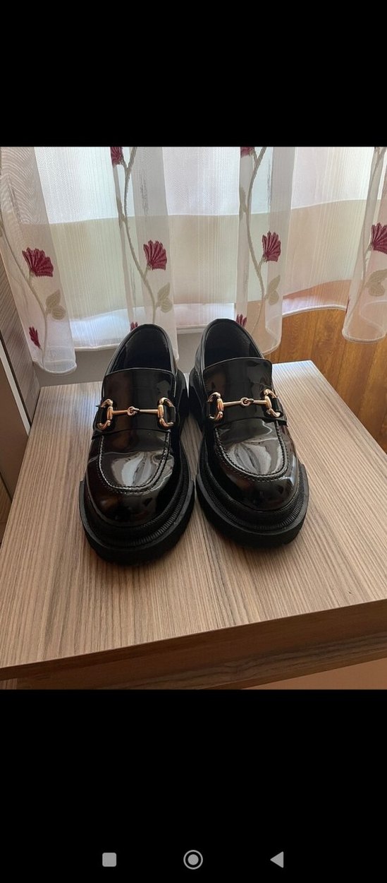Siyah parlak platform topuklu, tokalı ve yılan desenli kadın loafer, klasik şıklık için ofis kullanımına uygun. bir kere tek giyildi