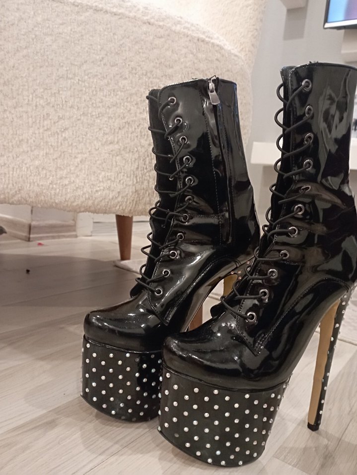 Siyah parlak kauçuk botlar, yüksek topuklu ve cesur gotik tarzda. Tokalı detaylar ve puantiyeli platform parti için uygun.