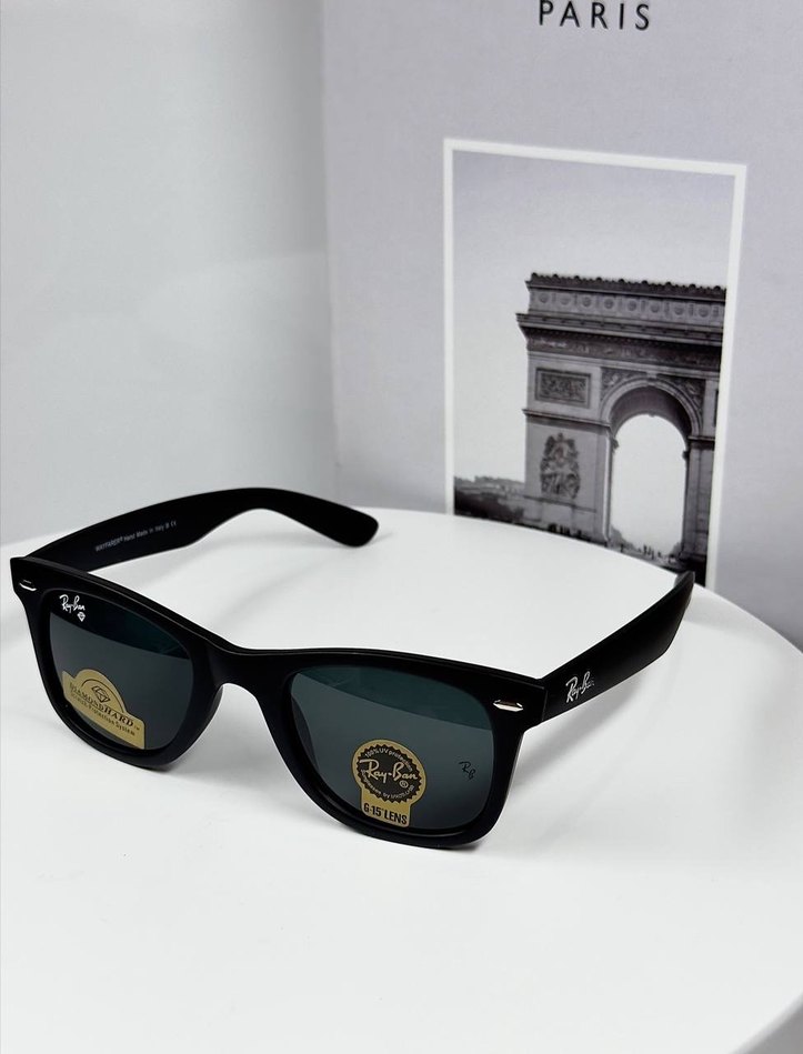 Klasik sokak stiline sahip siyah parlak Ray-Ban unisex güneş gözlüğü. Koyu camlı ve 'PARIS' yazılı detay içerir. ️