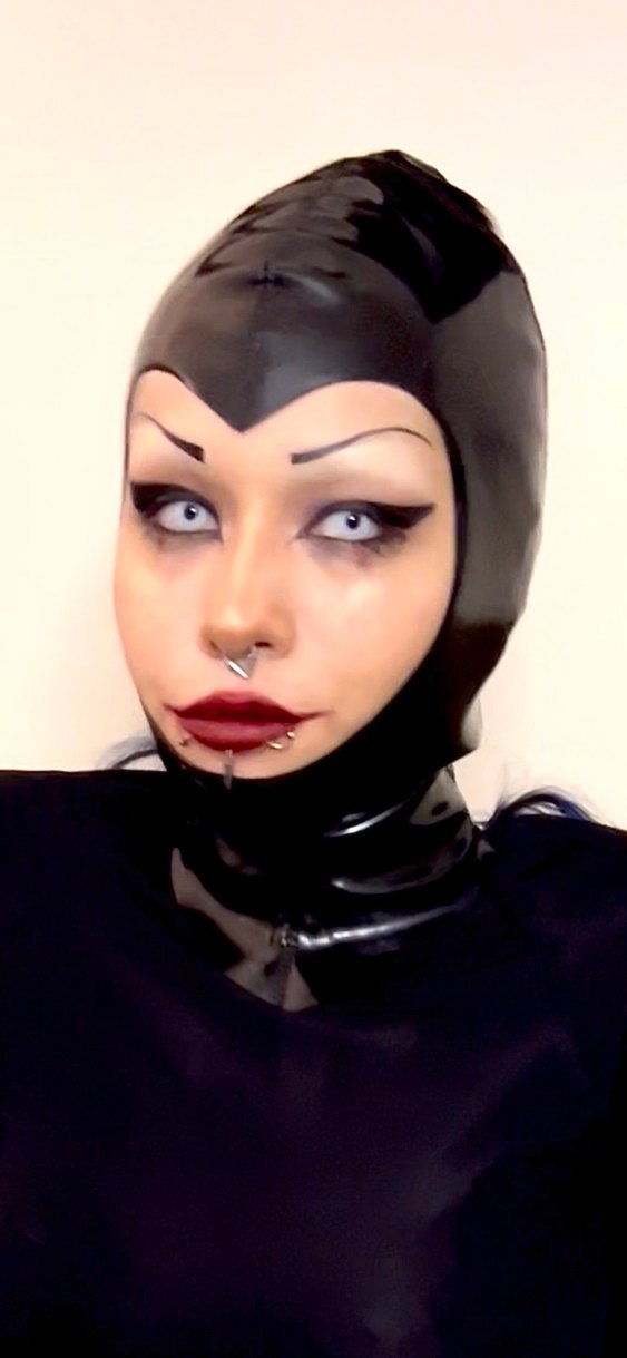 Başın tamamını kaplayan siyah parlak Rugan maske, pürüzsüz yüzeyiyle dikkat çekiyor.