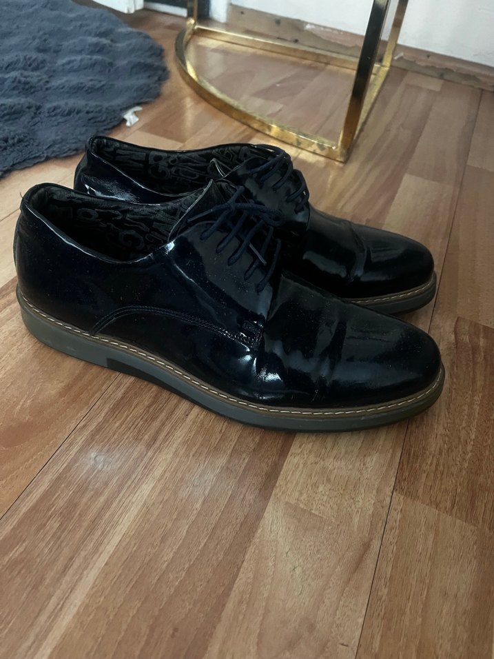 Parlak siyah yüzeye sahip, kauçuk tabanlı erkek klasik ayakkabılar. Goth tarzı ve trendy casual görünümüyle ofis için uygun, desensiz şık tasarım.