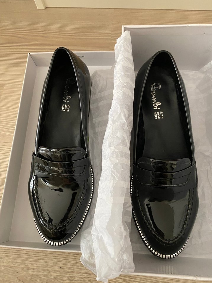 Siyah parlak rugan, blok topuklu ve pile detaylı kadın loafer. Ofis kullanımı için klasik zarafet sunar. 1 kez kullanıldı