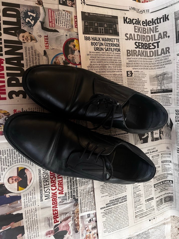 Siyah parlak rugan malzemeden, tokalı detaylı, iş stilinde, düz yüzeyli erkek klasik ayakkabı.