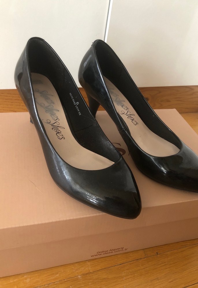 Siyah parlak rugan malzemeden yapılmış, klasik ve desensiz, ofis kullanımı için uygun gotik tarzda stiletto topuklu ayakkabılar.