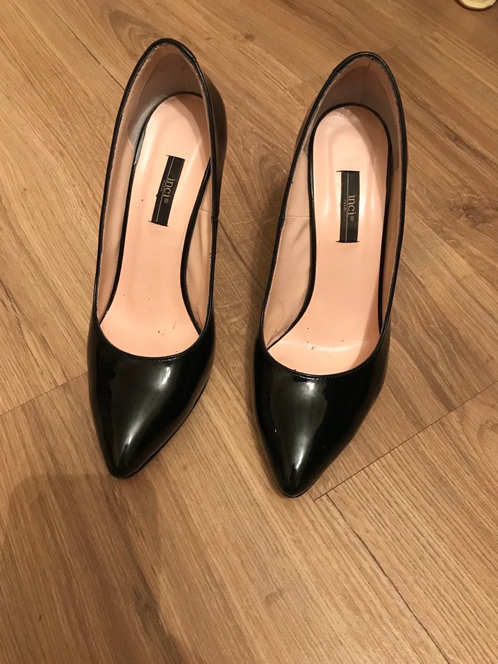 Siyah parlak rugan görünümlü, modern klasik tarzda, cesur tasarımlı, ofis için uygun, lastik malzemeden yapılmış sivri burunlu stiletto topuklu ayakkabılar.