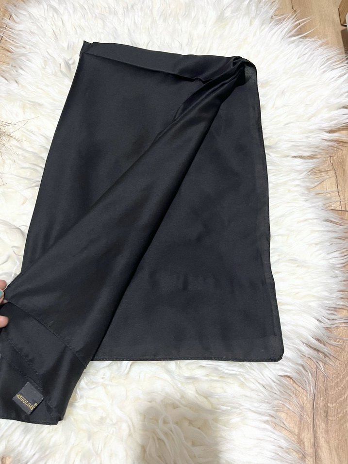 Siyah parlak saten dokusuyla ve hafif kürk detaylarıyla çağdaş ve rahat bir kadın şalı. Sade ve temel tarzlar için uygundur.