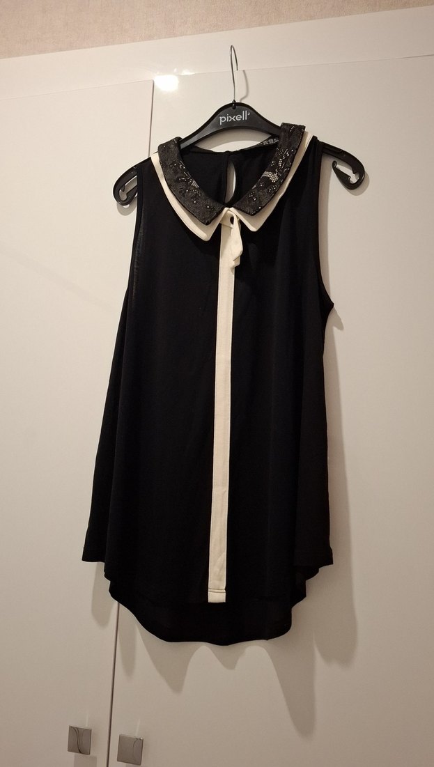Parlak siyah saten kumaştan, kolsuz ve yakalı. Bel detaylı, bol kesim ve midi boyda, ofis için uygun şık gömlek.
