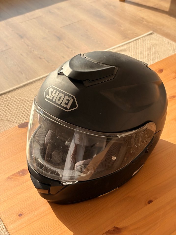 Siyah SHOEI motosiklet kaskı, tokalı kapanış ve parlak deri üzerinde minimalist baskıya sahip. Şeffaf vizörüyle klasik biker tarzı sunar. ️