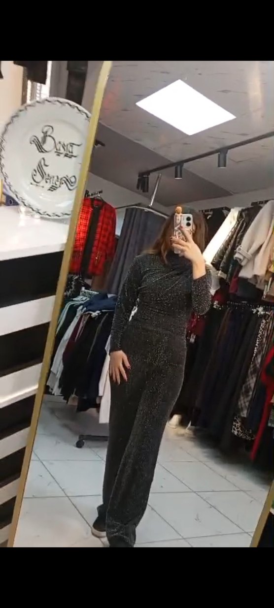 Dar kesim, yüksek yakalı ve uzun kollu siyah parlak sim desenli ikili takım parti için uygun. ✨ s-M beden mevcuttur.